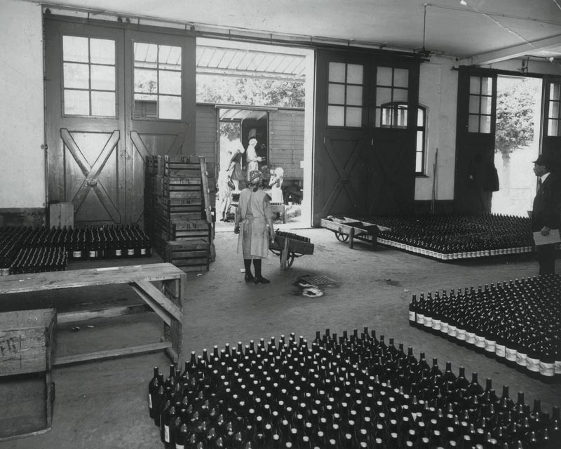 Mattoni introduces glass bottles with a paper label as his first innovation. The red eagle